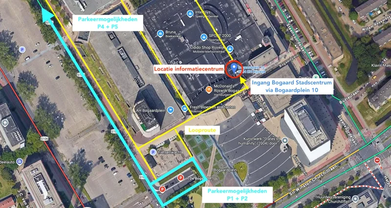 Let op: De inloopmiddag vindt plaats in het informatiecentrum, gelegen in het Bogaard Stadscentrum. De entree van het Bogaard Stadscentrum is te bereiken via Bogaardplein 10. Op bovenstaande plattegrond staan de parkeerlocaties en routes naar de locatie van het informaticentrum aangegeven. We adviseren dan ook om de instructies over de looproute op te volgen.